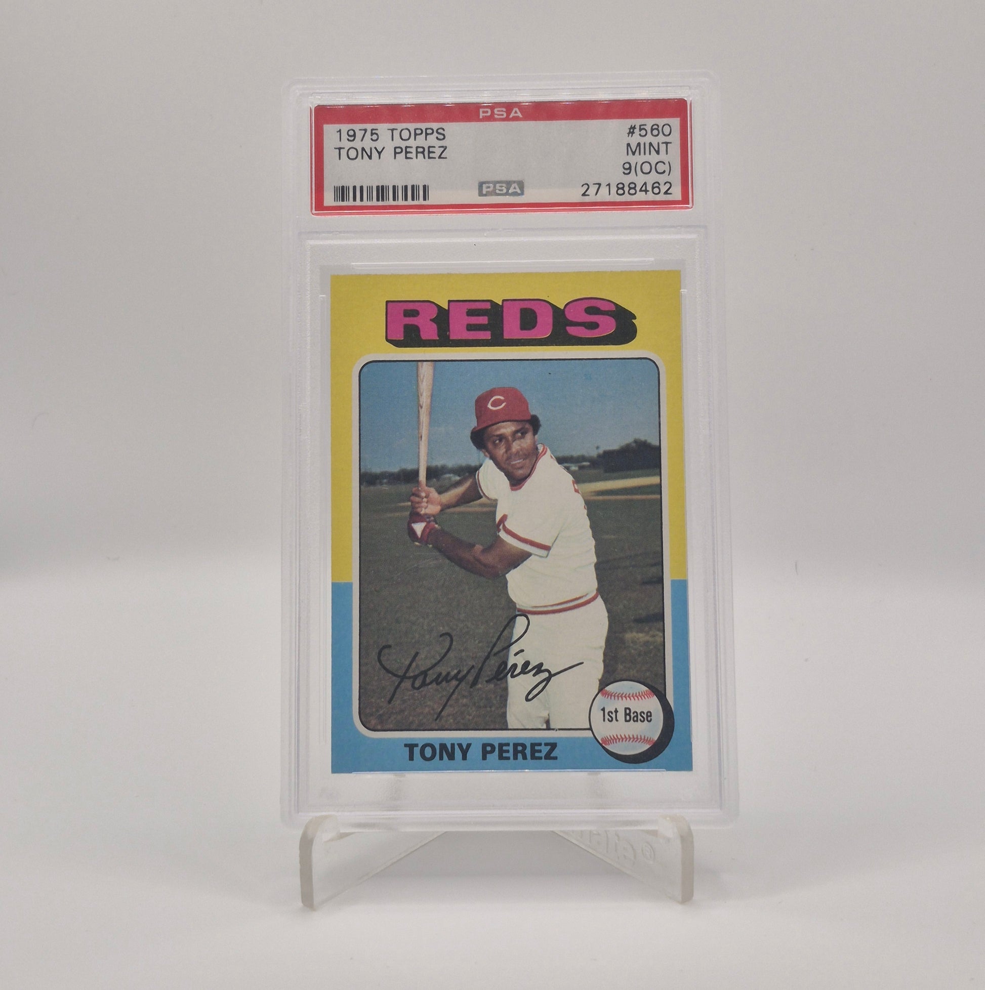 Add a Hall of Famer to your vintage collection with this 1975 Topps Tony Perez, graded PSA 9 (OC – Off Center, Near Mint-Mint). Featuring one of baseball’s legendary sluggers from the Cincinnati Reds’ Big Red Machine era, this card is a standout piece for serious collectors and Hall of Fame enthusiasts.