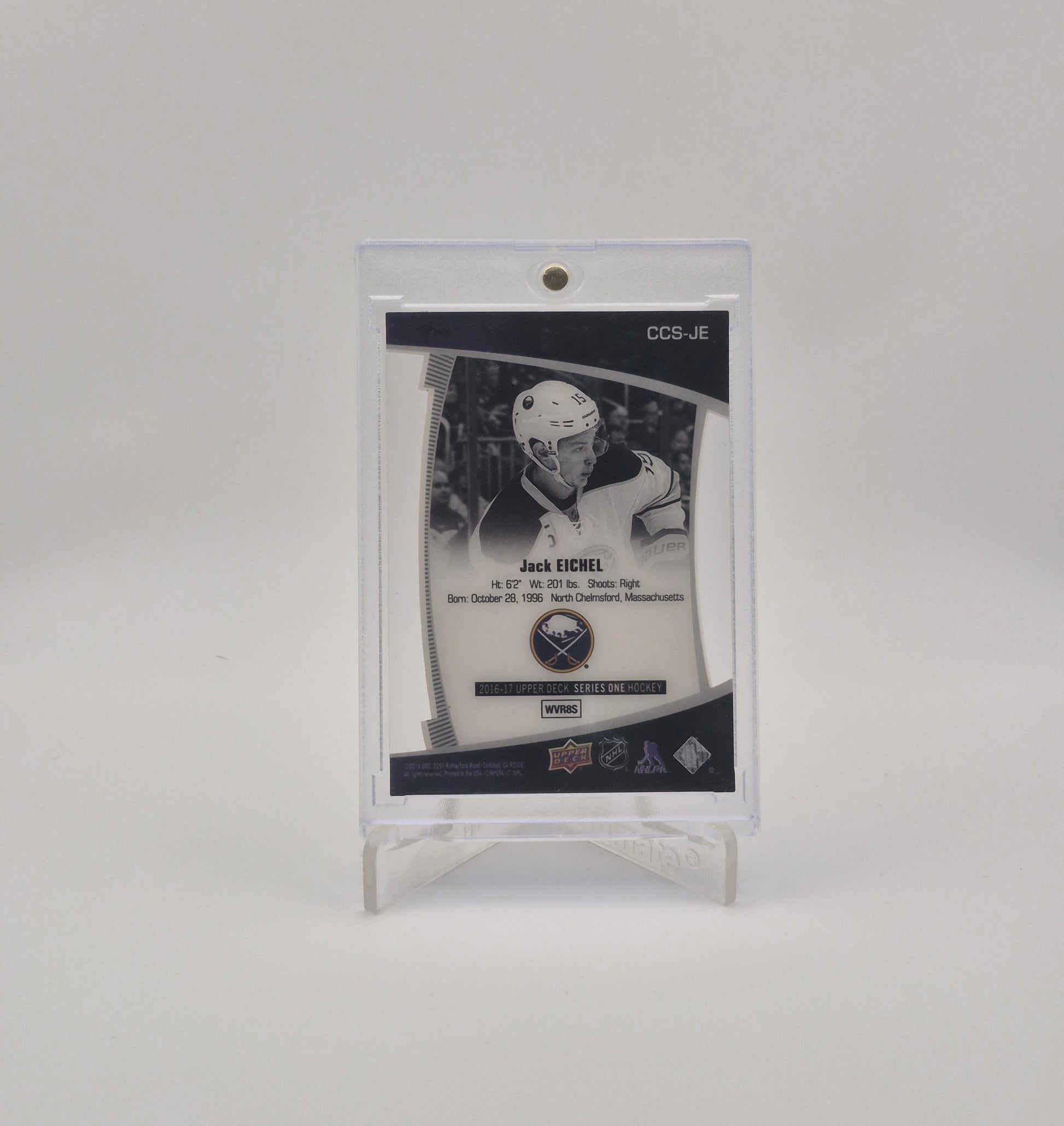 Celebrate one of hockey’s elite talents with this 2016-17 Upper Deck Jack Eichel Clear Cut Superstars acetate insert. Featuring a crystal-clear design and premium finish, this collectible highlights Eichel’s dynamic play and status as one of the league’s top offensive stars during his early career.
