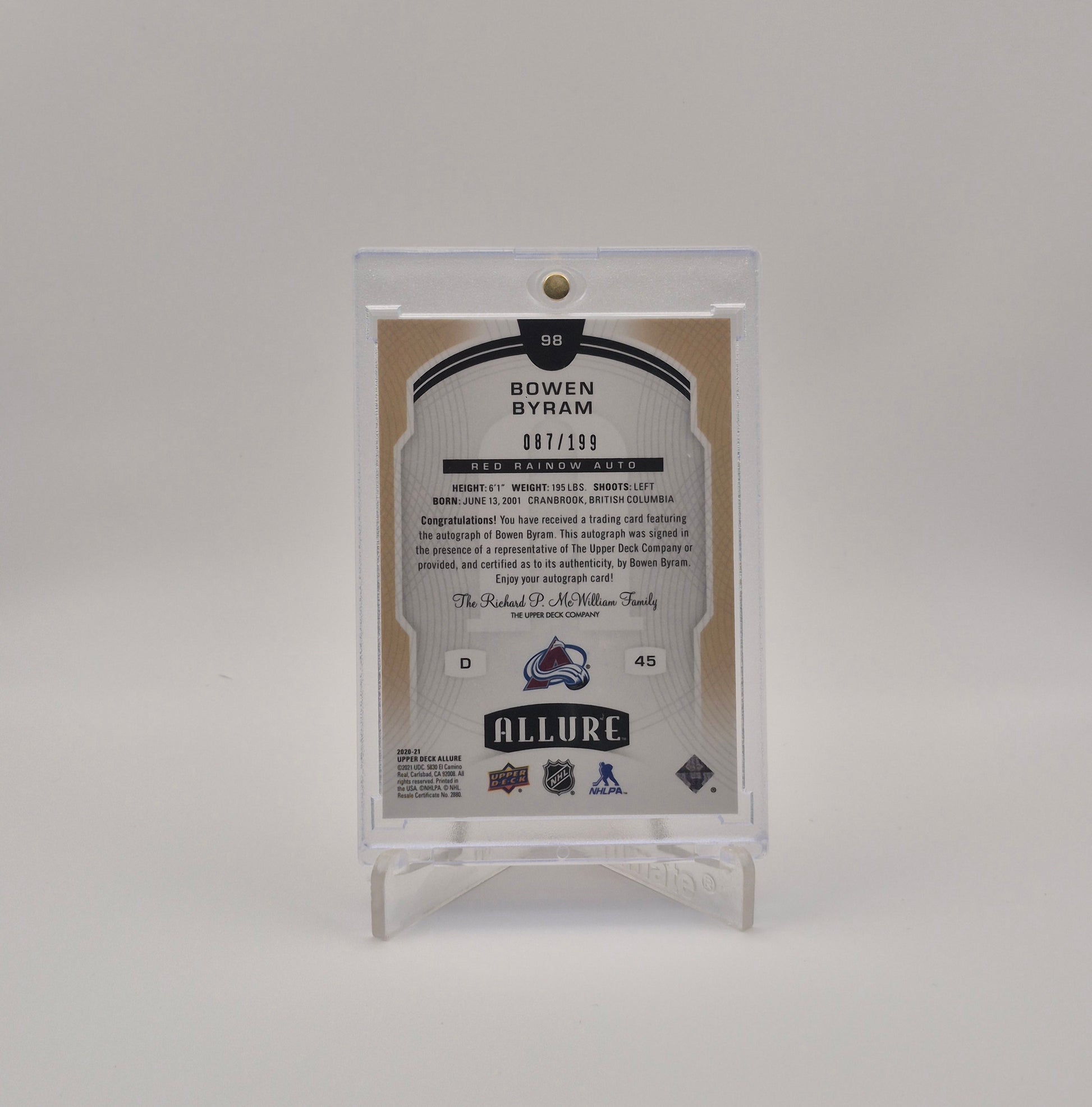 Add some color and star potential to your collection with this 2020-21 Upper Deck Allure Bowen Byram Red Rainbow Autograph, serial numbered to /199. Featuring a vibrant red refractor finish and a bold on-card signature, this card showcases one of the NHL’s most promising young defensemen during his rookie season with the Colorado Avalanche.