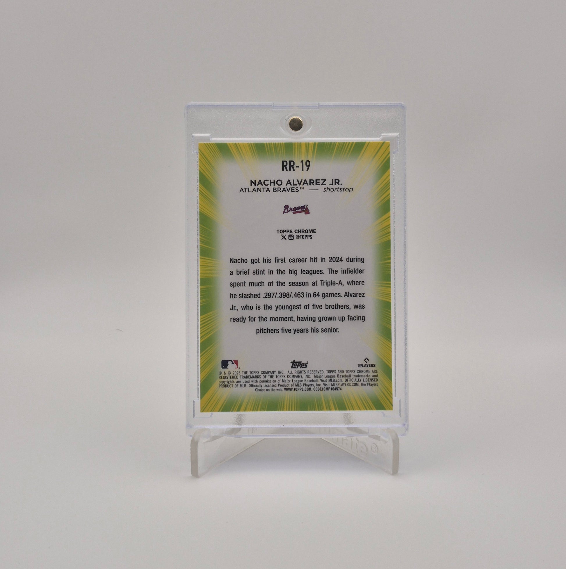 Perfect for rookie collectors and fans of future MLB stars, this Nacho Alvarez Jr. Radiating Rookies card combines eye-catching design and modern hobby appeal — a standout addition to any baseball card collection.