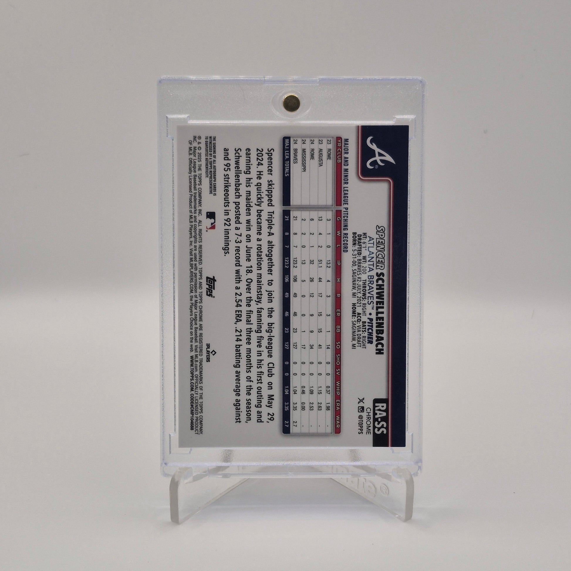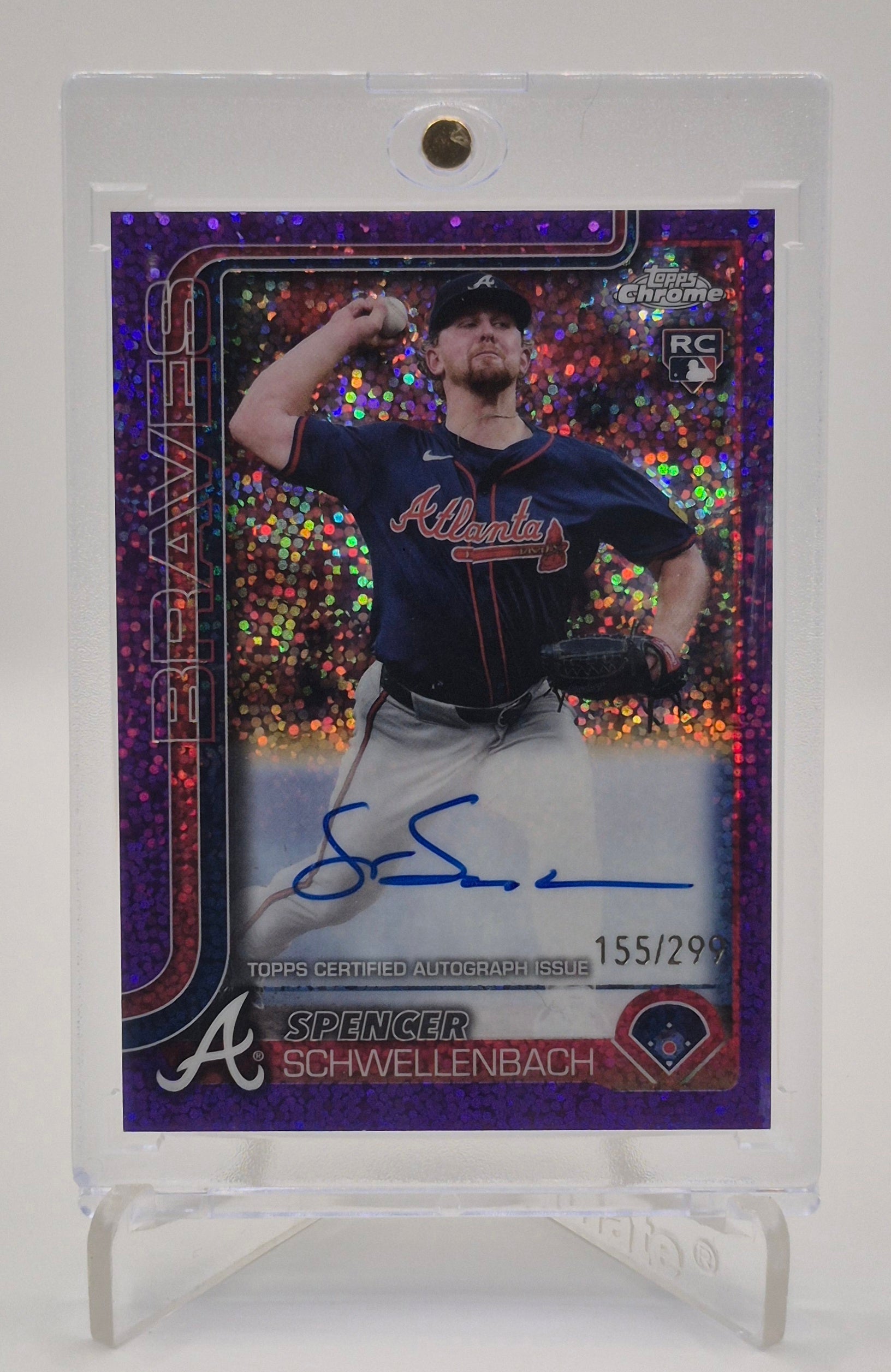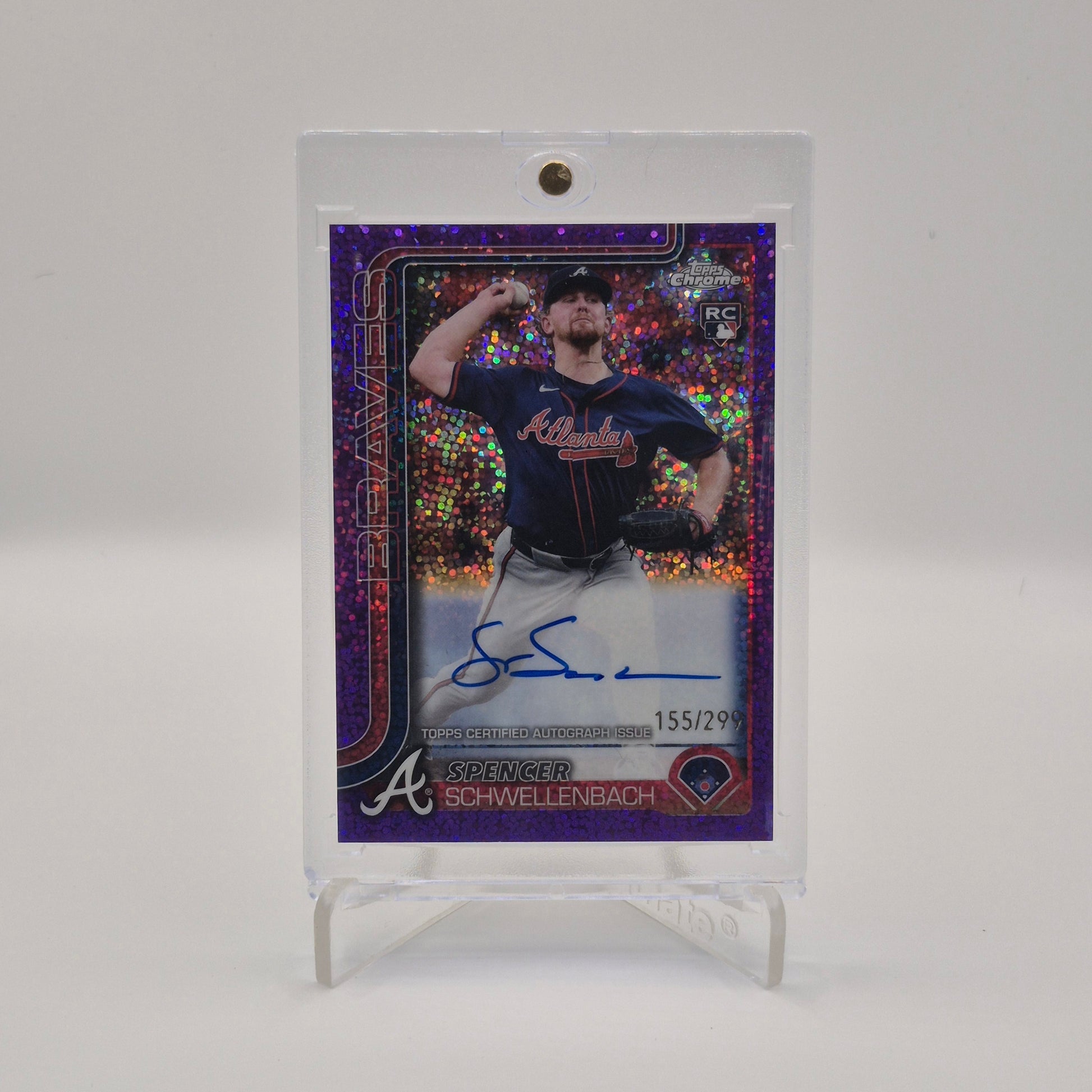 Perfect for Braves fans, autograph collectors, and rookie card investors, this Spencer Schwellenbach Topps Chrome Purple Speckle Auto /299 blends premium Chrome design with the rarity of a numbered parallel.